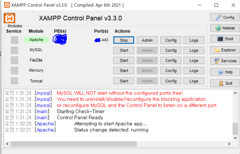 우선 Apache 를 Start눌러 서버를 시작합니다.