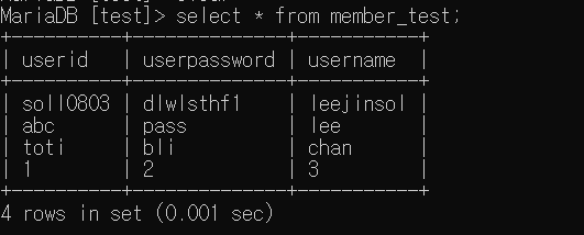 코드는 다음과 같이 작성합니다.(저는 member_test 테이블에 값들을 4개 넣어줬습니다.)