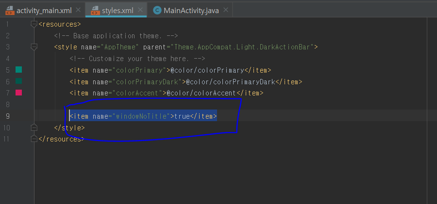 <item name='windowNoTitle">true</item> 한줄을 추가해주면 모든 액티비티에서 상태바가 사라진다.