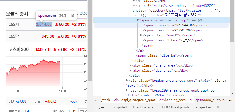 코스피지수의 span.num 해당클래스이름과 태그등이 나옵니다.