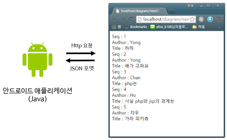Seq : 1 Author : Yong...... 등의 내용을 가져온다. 위 웹페이지에서 띄워진 내용들은 모두 echo로(JSON 형태 ) 띄운 것이다.