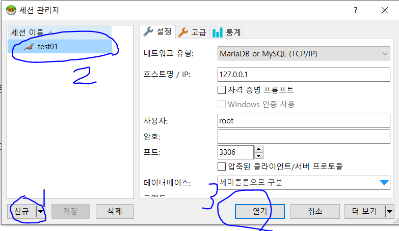 신규를 눌러서 새로운 세션을 만들어주고