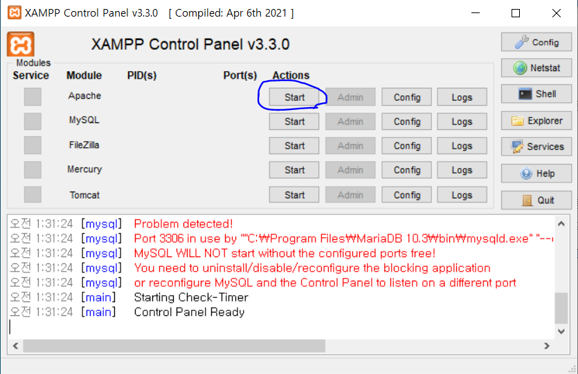 설치가 완료되면 Apache 를 Start 해줍니다.
