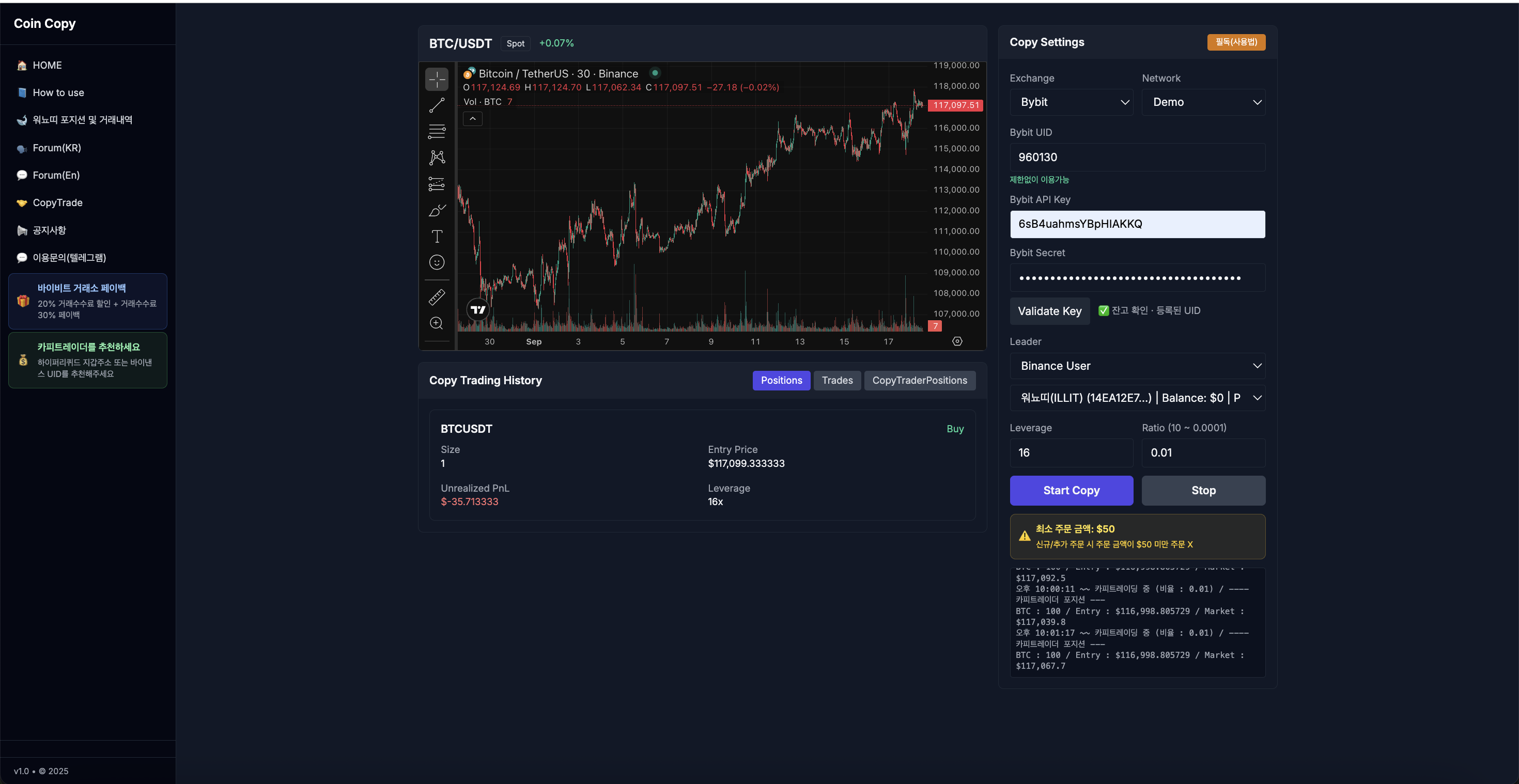 저는 바이비트를 통해 카피트레이딩봇을 사용해서 카피트레이딩중인데