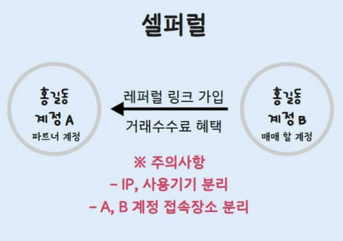 셀퍼럴이란 한 명의 사용자가 계정을 2개 만들어서 레퍼럴 링크로 계정 한 개를 가입시킨 후 수수료를 받는 것을 말합니다.