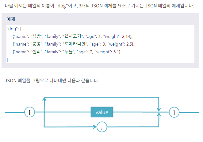 JSON배열은 쉼표 , 를 사용하여 여러 JSON 데이터를 포함할수있다.