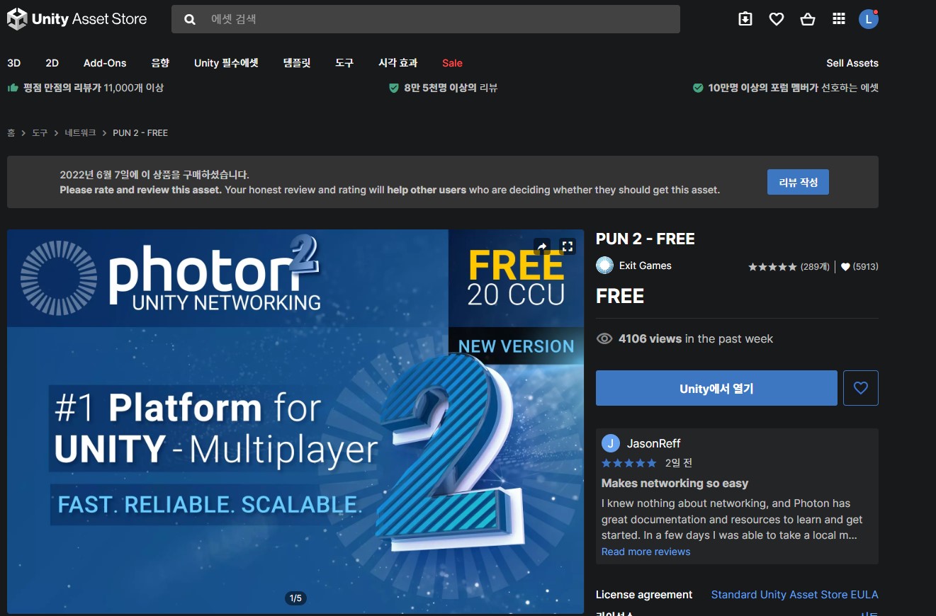 그리고 유니티 Asset 스토어에서 PUN2 -FREE를 다운로드 and Import 해준다.